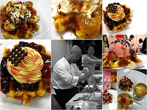 兩架四方形的比利時鬆餅機,由小助手專職負責烤餅;一次最多八個麵糰,約莫五分鐘,糰熱餅熟,須先快速冷卻使其表面酥脆,再由 David 主廚負責組合擺盤。視客人點單而定,基本經典口味約五六款,利用鮮奶油、卡士達醬、冰淇淋等佐料變化,衍生出二三十種產品。