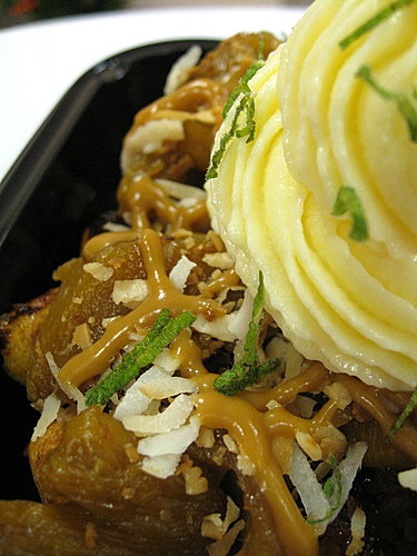 香酥厚脆的鬆餅,舖滿柴燒土鳳梨乾果餡,微甜不酸,有著耐人尋味的深度;再灑上椰絲、薄荷,最後將卡士達醬置於其中,妝點些檸檬絲,佐以焦糖醬。