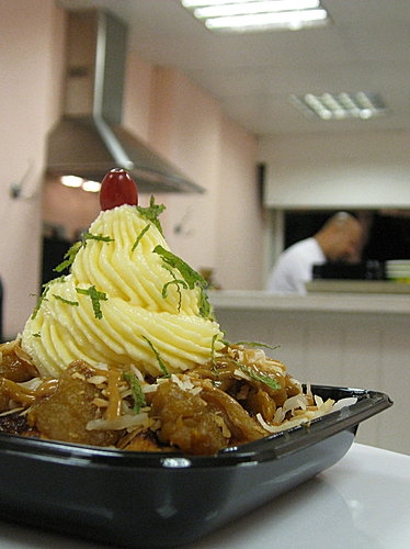 香酥厚脆的鬆餅,舖滿柴燒土鳳梨乾果餡,微甜不酸,有著耐人尋味的深度;再灑上椰絲、薄荷,最後將卡士達醬置於其中,妝點些檸檬絲,佐以焦糖醬。